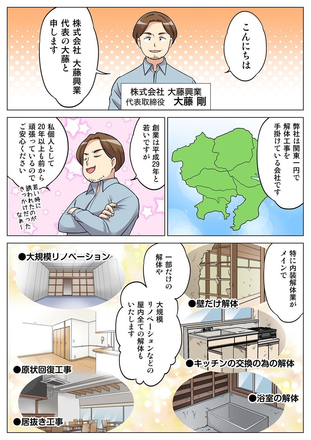 株式会社大藤興業は、関東一円で建物の解体工事を行っています。内装から戸建て、店舗の改装、リノベーションのためのスケルトン工事まで柔軟に対応いたします。